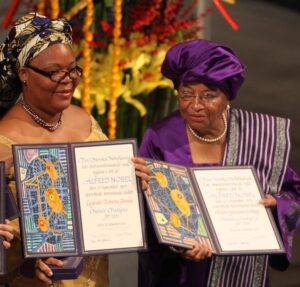 Leymah Gbowee and Ellen Johnson Sirleaf received the Nobel Peace Prize, 2011. Image courtesy of Harry Wad is modified and licensed under CC BY-SA 3.0.